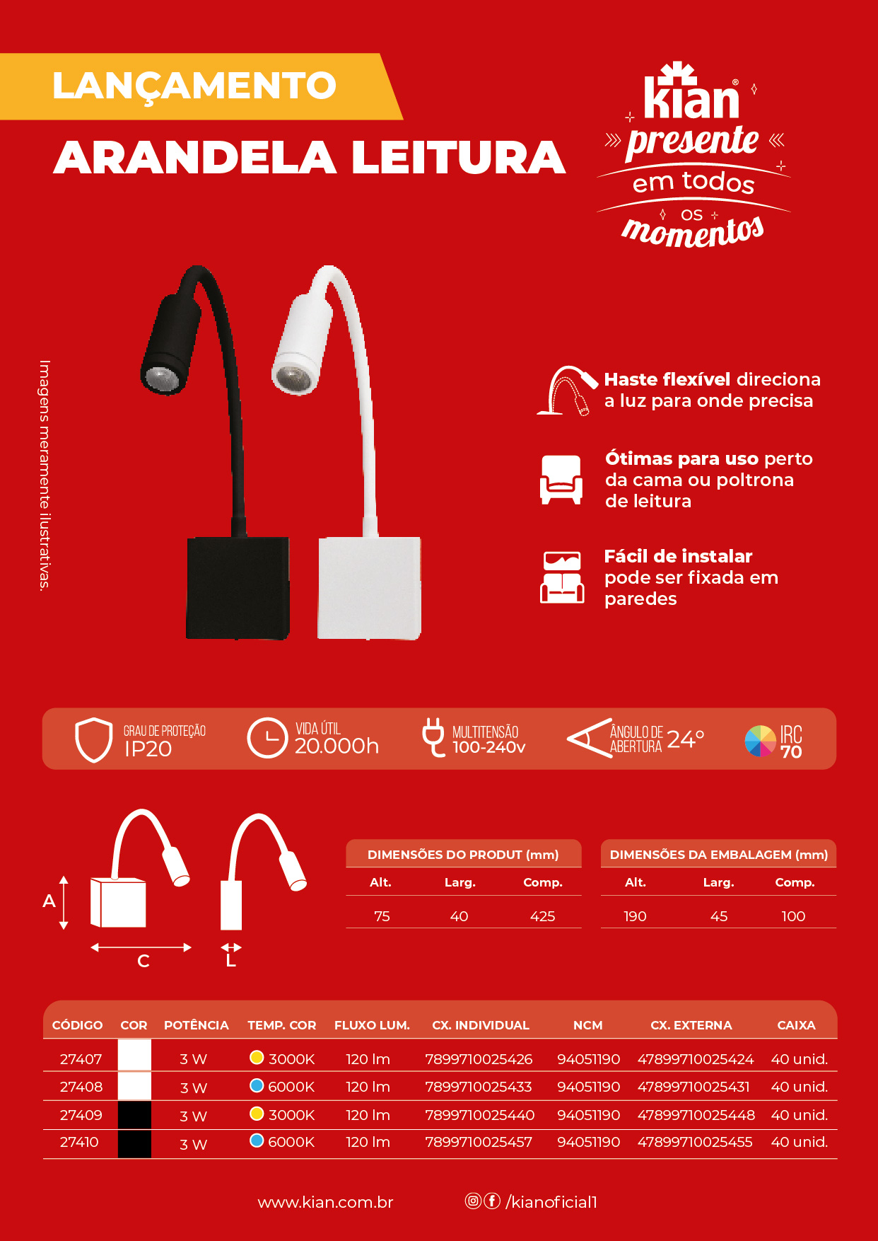 | 27407 | 3W | Branco | 3.000K | 120lm | A. 40mm X L. 50mm | 7899710025426 | 40unid. |