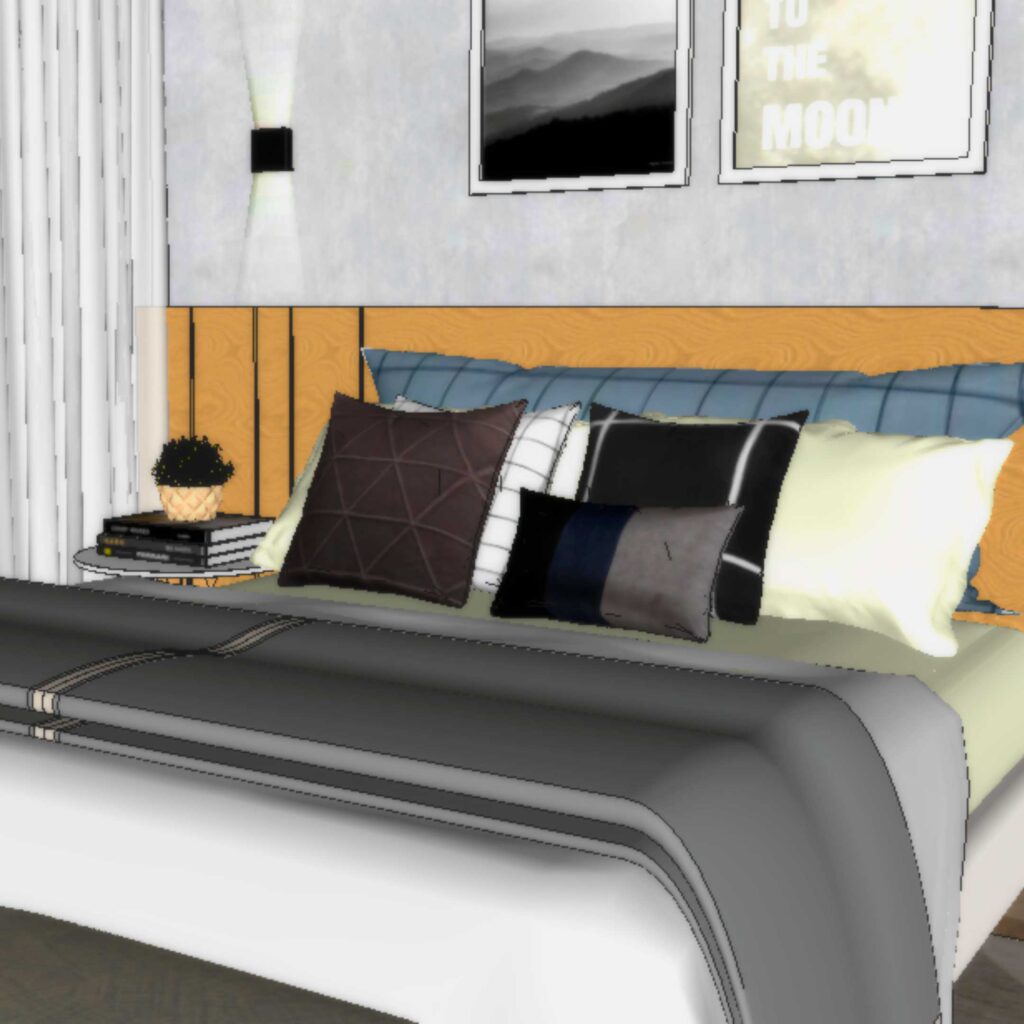 Para este projeto de quarto casal, utilizamos o Spot Trilho Kian (cód. 14661), na cor preta, como iluminação geral. Para iluminação pontual, optamos pelas Arandelas direcionais (cód. 14920), uma em cada lado da cama. Vale lembrar que todos os produtos possuem temperatura de cor quente (luz amarela), ideal para um local de aconchego e relaxamento, que é a nossa proposta para o cômodo.