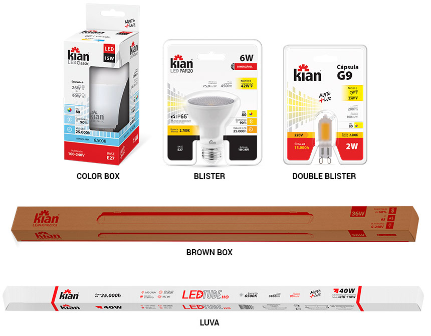 Para abrigar os nossos produtos contamos com diferentes tipos de embalagens que são escolhidas de acordo com a especificidade de cada item. Para a escolha levamos em conta fatores como: design do produto, otimização do espaço no armazenamento e no ponto de venda, custo-benefício da embalagem, qualidade do material, entre outros. Abaixo seguem exemplos de cada tipo de embalagem que possuímos em nosso portfólio.