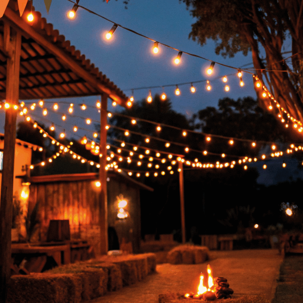 Se a ideia é trazer o clima das festas juninas do interior, aposte na Incandescente Color Bolinha. Ela oferece uma iluminação quente e romântica, ideal para destacar paredes decoradas, barracas temáticas e ainda vai bem no varal de luz.