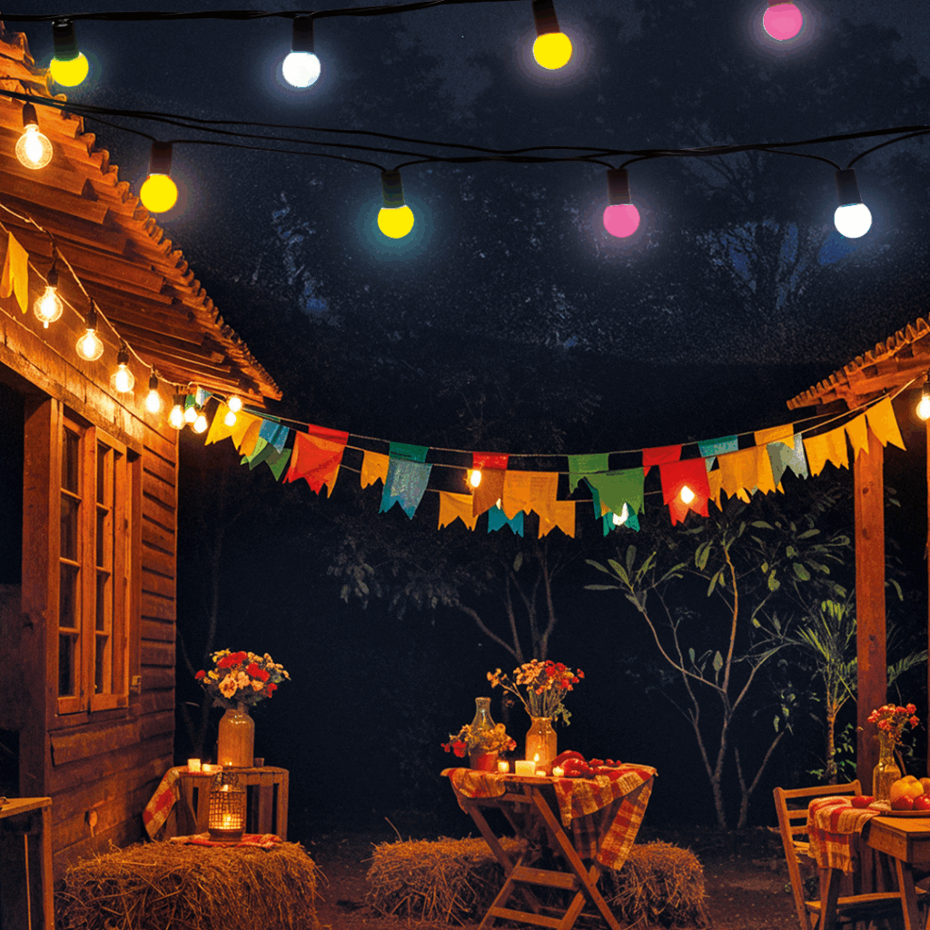 Quer deixar sua casa ou loja no clima das festas juninas? A iluminação é um dos elementos mais importantes na decoração dessa época tão querida. Com soluções simples, como Varal de luz, LED Color Bolinha e Incandescente Color Bolinha, é possível criar ambientes incríveis com segurança e estilo.