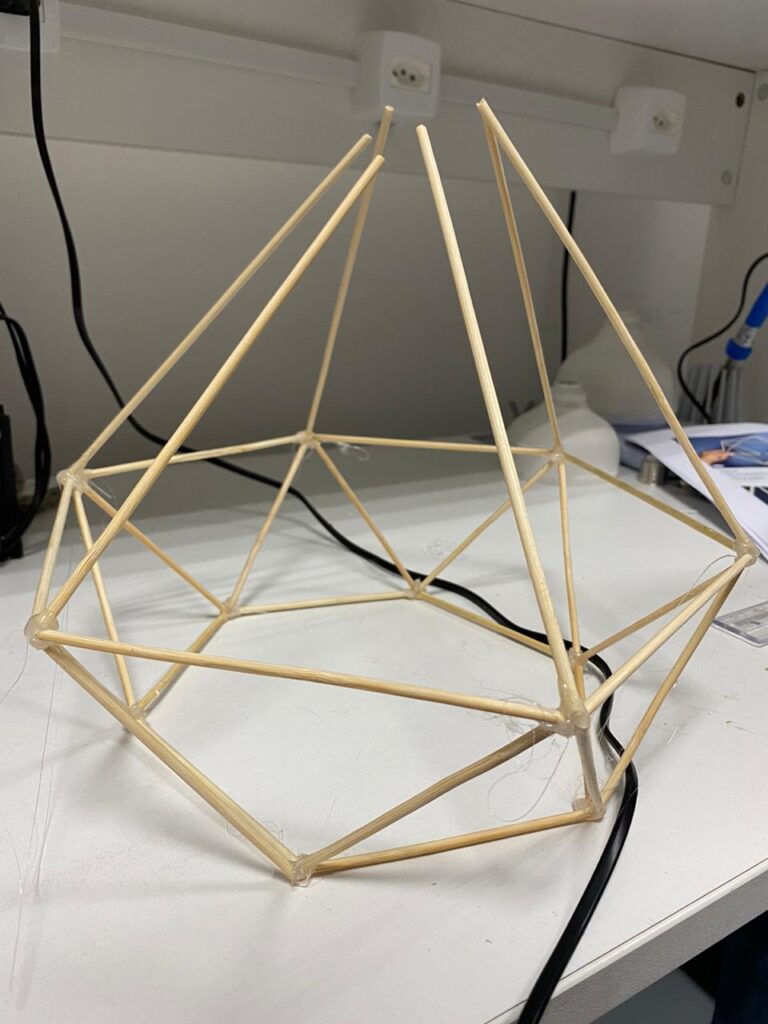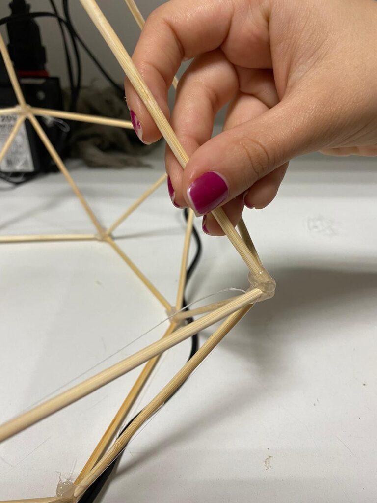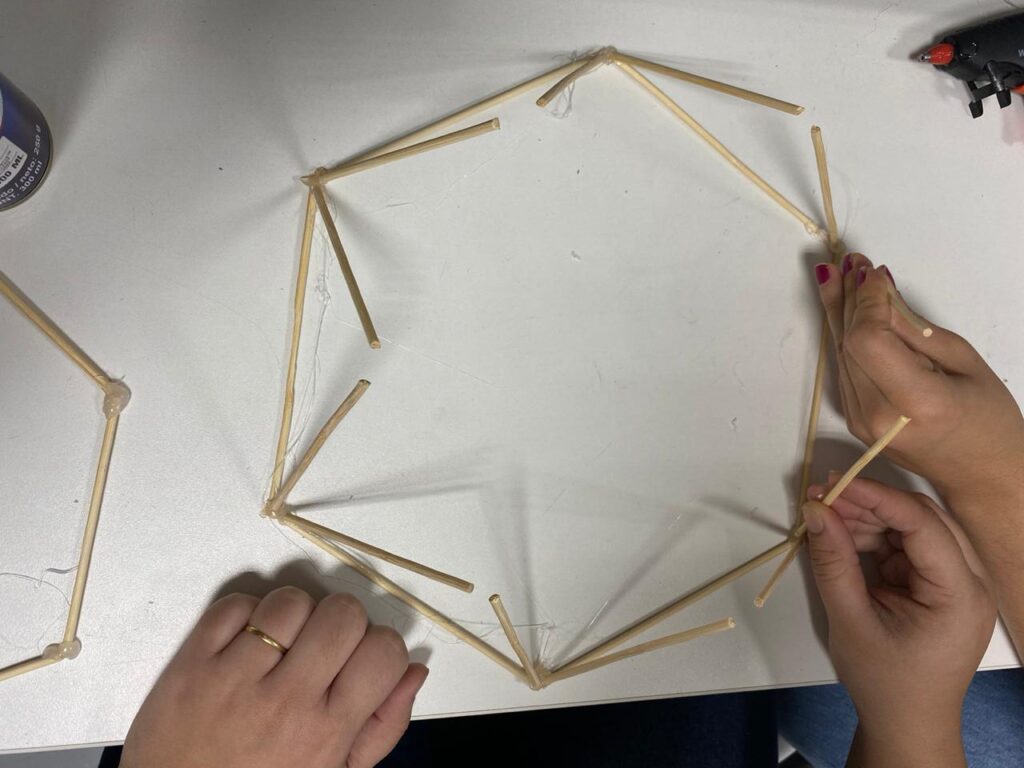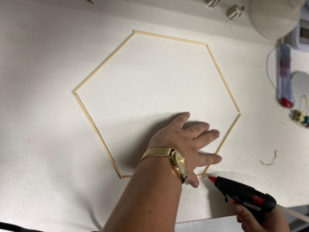 6) Cole os palitos de 20 cm em cada extremidade do hexágono maior, de forma que todos os palitos apontem para o centro do pendente, conforme na foto abaixo: