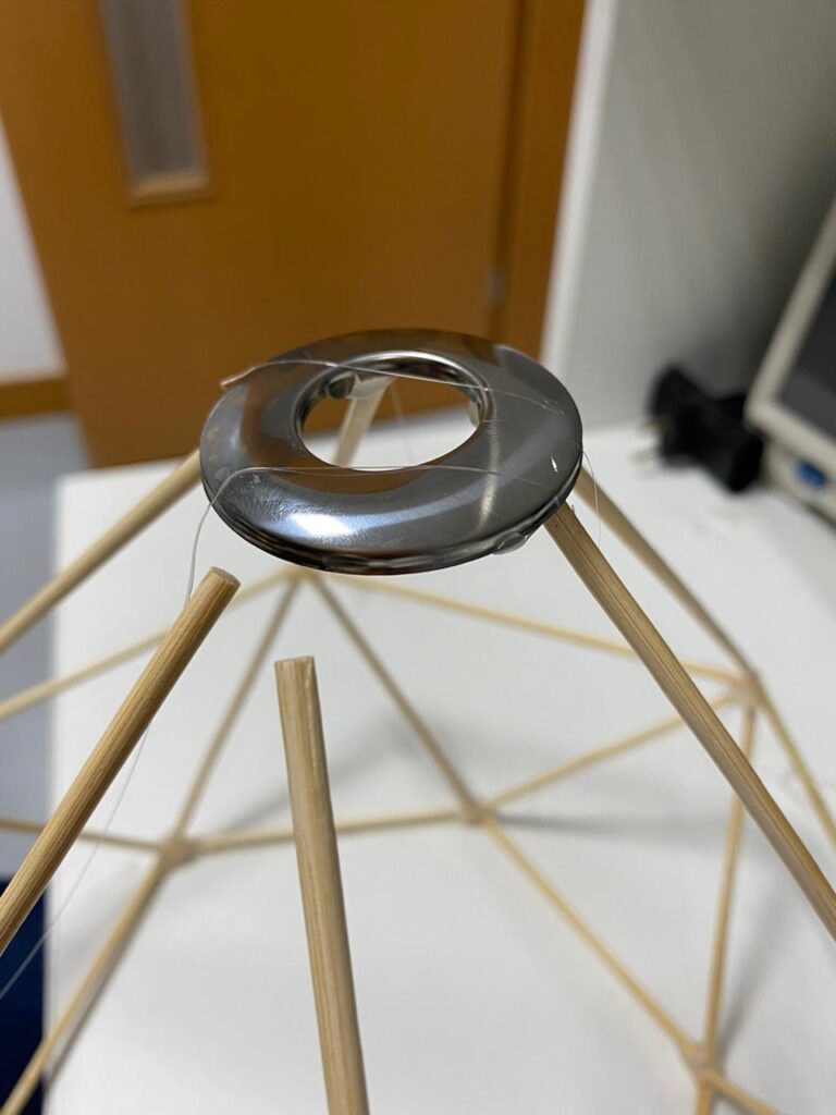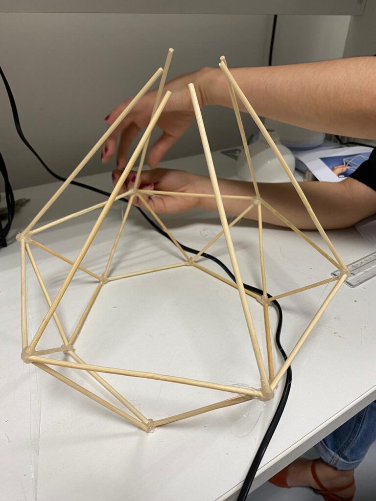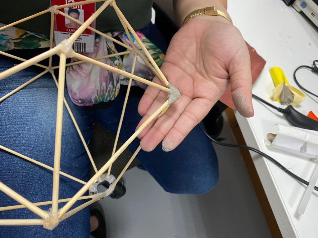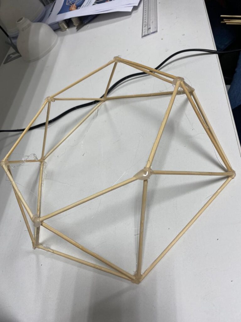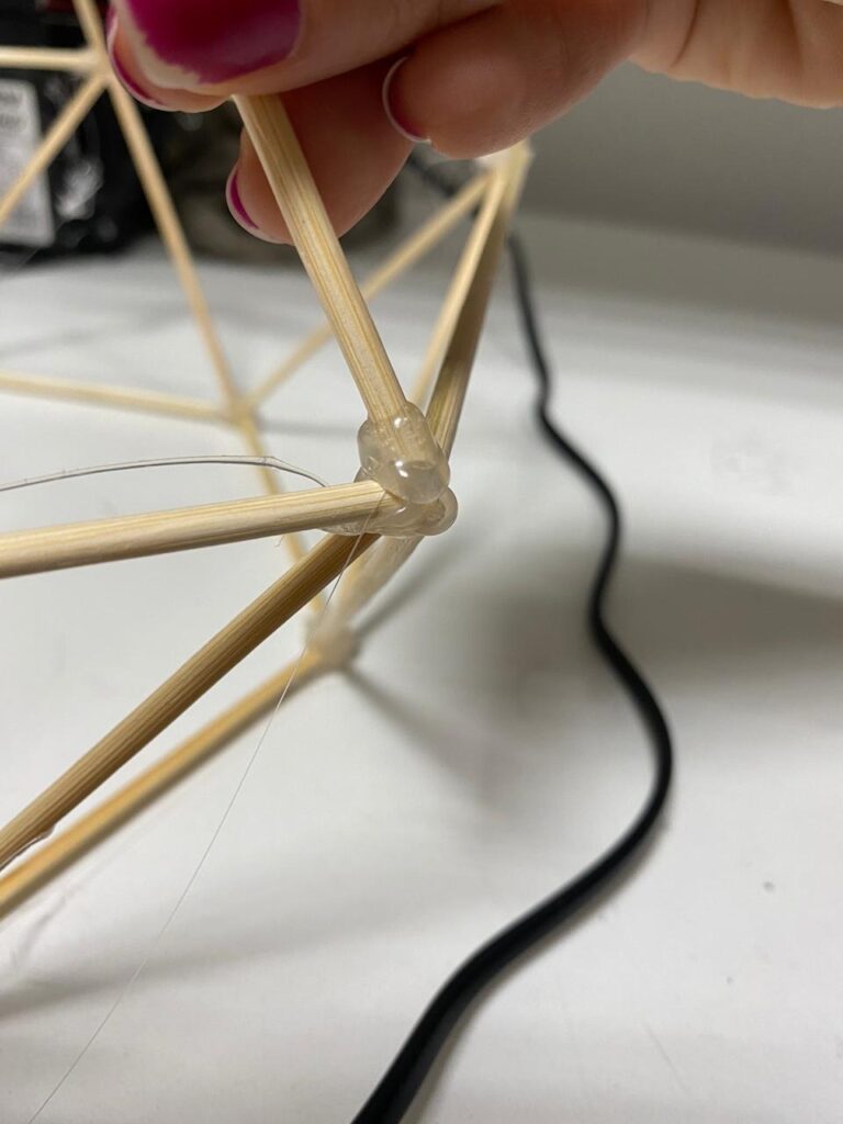 6) Cole os palitos de 20 cm em cada extremidade do hexágono maior, de forma que todos os palitos apontem para o centro do pendente, conforme na foto abaixo: