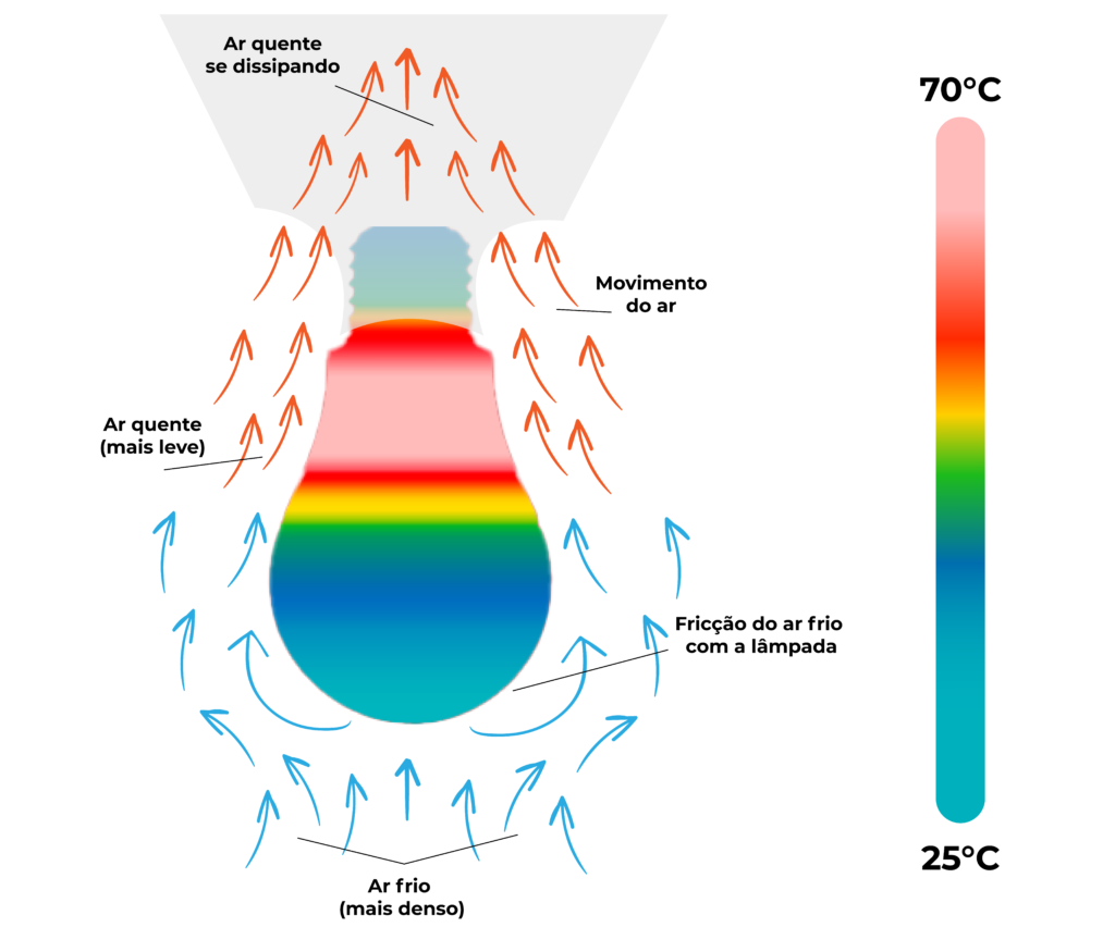 Em usos prolongados dessa forma, a durabilidade da lâmpada acaba sendo afetada, assim como parte de sua eficiência luminosa. Por isso, para aproveitar todos os benefícios da lâmpada LED, priorize seu uso em luminárias ou pendentes abertos, com abertura para ventilação na parte superior. Esses modelos de luminária facilitam a dissipação de calor através do fenômeno conhecido como troca de calor por convecção, onde o ar quente que estava ao redor do corpo da lâmpada sobe e o ar frio ocupa este mesmo lugar, refrigerando o corpo da lâmpada. Vale lembrar que esse fenômeno de troca de calor por convecção ocorre enquanto o corpo da lâmpada estiver com a temperatura maior em relação ao ambiente, conforme você pode observar no esquema abaixo: