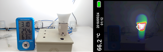 Em nosso laboratório, a equipe do Departamento Técnico realizou a medição com câmera térmica em uma lâmpada LED, conforme você vê mais abaixo (você nota a mesma lâmpada e os demais equipamentos nas duas fotos). A temperatura ambiente é de 25,4°C e o corpo da lâmpada, após o período de estabilização, está em 66,2°C.