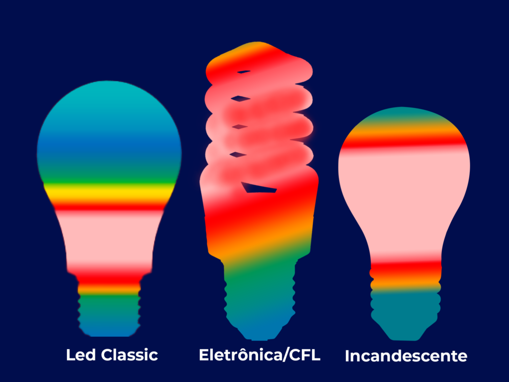 Os pontos de maior aquecimento também variam de acordo com cada modelo de lâmpada. Na imagem abaixo, você confere os pontos mais quentes nas lâmpadas Incandescente (cima), LED (à esquerda) e eletrônica (à direita). Os pontos mais quentes são identificados pelas cores vermelho e branco.